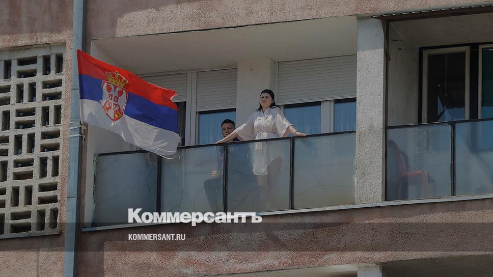 Сербская семья вывесила флаг Сербии на балконе своей квартиры в Косовска-Митровице