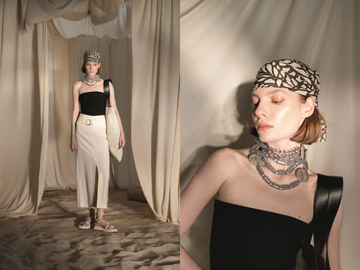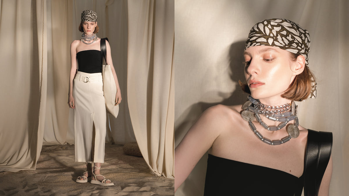 Костюмы и вещи из льна и хлопка, свободные рубашки и широкие брюки, юбки и легкие топы, а также шелковые шарфы, шляпы и открытая обувь. Все это стало фундаментом показа ЦУМа — вещи из коллекции универмага будут уместно смотреться в жарком южном городе или на побережье. Цветовая гамма большинства образов была сдержанной — стилисты сделали ставку на бежевый, песочный и белый цвета с вкраплениями ярких оттенков.