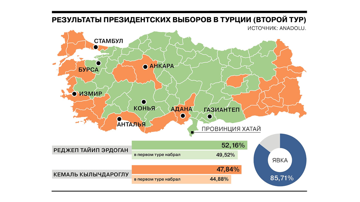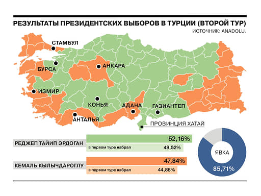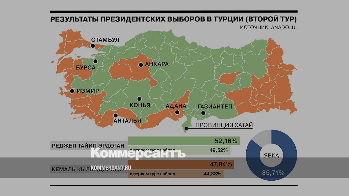 Региональный расклад практически не изменился. Эрдоган победил в 52 провинциях, Кылычдароглу — в 29. Как и в первом туре, оппозиционного кандидата поддержали крупные города (Стамбул, Анкара, Измир) и курортная Анталья. Большинство проживающих в России турок также голосовали за соперника Эрдогана.