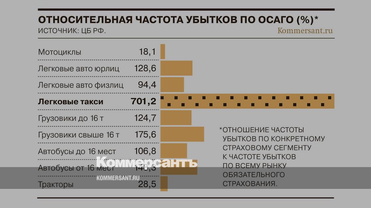 Ранее ЦБ также сообщал, что страхование такси убыточно — за период наблюдений (начиная с 2018 года) по полисам ОСАГО такси страховщики выплачивают больше, чем собирают премий.