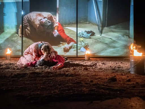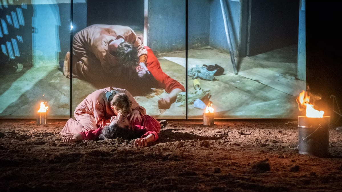 Мило Рау увидел рифму между античной героиней, не побоявшейся похоронить своего погибшего брата, и бразильскими революционерами, протестующими против сегодняшнего капитализма. Какой бы произвольной или, наоборот, прямолинейной ни казалась многим такая ассоциация, «Антигона в Амазонии» с художественной точки зрения выглядит вполне убедительно. Она смонтирована из видеофрагментов, снятых в Амазонии, и «живого плана» в исполнении актеров на сцене NTGhent. Итак, на почти пустой сцене в Генте — бразильские актер Фредерико Араужо и музыкант Пабло Казелла и гентские актеры Сара Де Бошер и Арне Де Тремери. На опускающихся и поднимающихся экранах — видеозаписи, на которых чередуются разыгранные в Бразилии сцены из «Антигоны» и разговоры с активистами MST.
