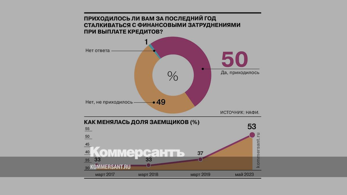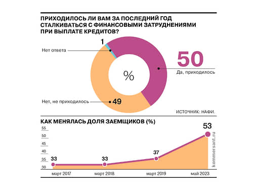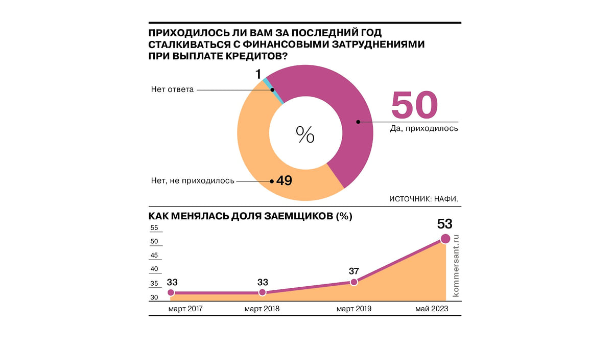 Как показал опрос аналитического центра НАФИ, доля россиян, которым за последний год приходилось брать или выплачивать кредит в банке, увеличилась с 33% в 2017 году до 53% в 2023 году. При этом каждый второй из тех, кто пользовался кредитными средствами за последний год, хотя бы раз сталкивался с финансовыми затруднениями при выплате кредита. Чаще всего испытывали проблемы респонденты в возрастной группе 25–34 года и люди без высшего образования.