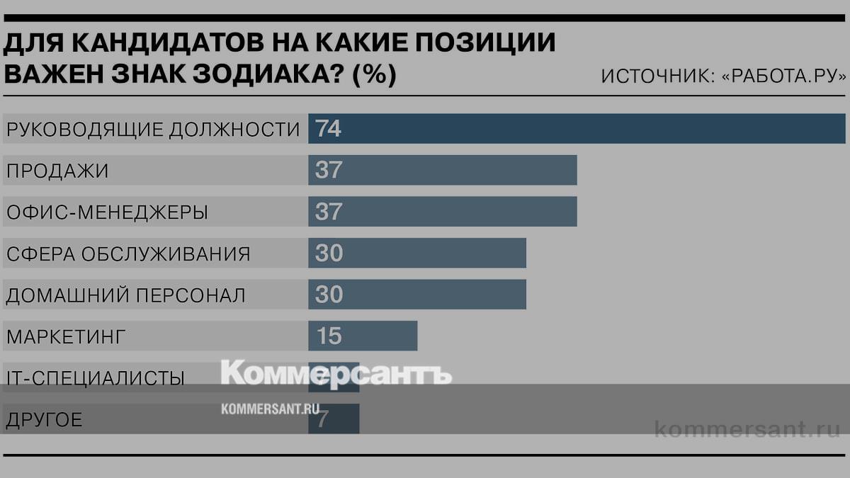 В каждой седьмой российской компании учитывают астрологические особенности при выборе соискателя, показал опрос сервиса автоматизации подбора и обработки резюме «СберПодбор» и сервиса для поиска работы и сотрудников «Работа.ру». Причем 7% смотрят на знак зодиака всегда и еще 7% — в зависимости от позиции, на которую ищут человека. По мнению респондентов, наибольшее значение он играет для претендентов на руководящие должности, наименьшее — для IT-специалистов.