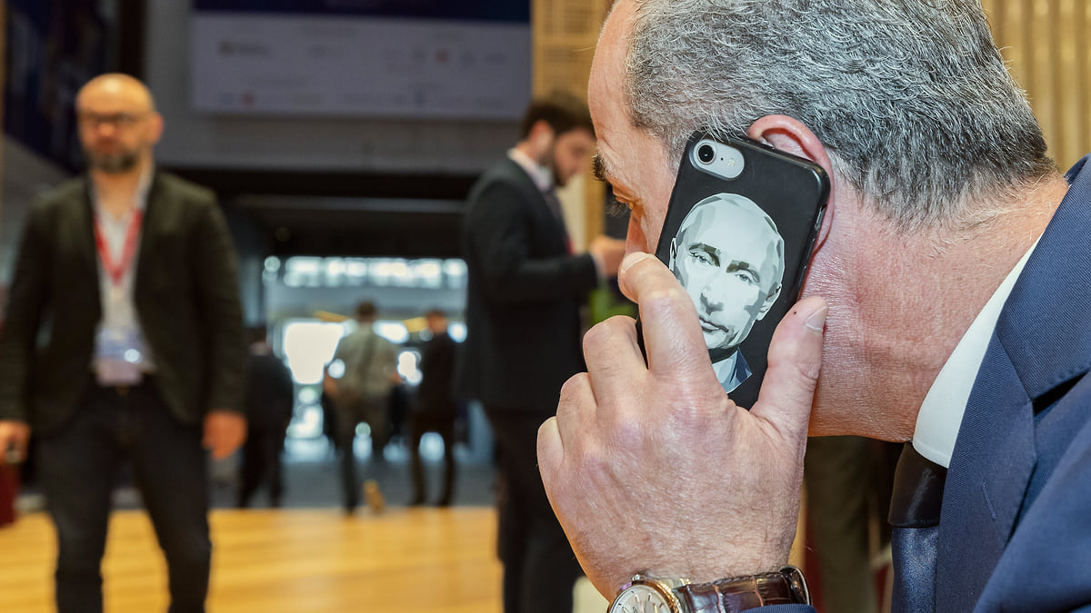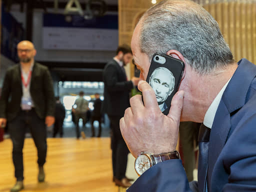 Участник ПМЭФ говорит по телефону