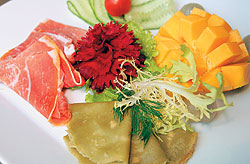 Пармская ветчина с тайским манго, личи и чайными блинчиками в «Шанти» — пример вкусного сочетания кулинарных традиций Запада и Востока