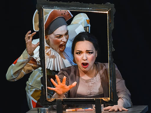 В слегка утрированных темпах, подчеркнуто танцевальном движении и роскошном ансамблевом балансе на сцене разворачивается камерное, почти кукольное зрелище, напоминающее разом о театре XVIII века (время действия по либретто), о театральных обыкновениях 1850-х (премьеру «Бала» сыграли в 1859-м в Риме) и о традициях 1950-х — времени едва ли не массовой популярности оперы вообще и вердиевского блокбастера в частности. Вместо выдуманного бостонского губернатора и его окружения мы видим порядком измотанную труппу на гастролях, но интрига с переодеваниями, заблуждениями и убийством из-за ревности в точности сохраняется. На сцене — немного покосившийся деревянный помост, тряпочный занавес, гримерные столики, кофры на колесиках и вешалки, но не все так просто. Зеркало в гримерке — пустая рамка, а куски зеркала припрятаны в потертых складках декораций (художники — сам режиссер и Валерия Барсукова). В них отражаются актеры, персонажи, музыканты, и кажется, что обнажаются их мысли и чувства. Ненарочитая проекция раздвигает фантазийное пространство оперы-шапито до откровенной фантасмагории, пока публика занята расследованием действительных и вымышленных преступлений. В поисках настоящего убийцы ошибки тем фатальнее, чем очевиднее, что вердиевский паж Оскар с ртутным голосом Ирины Байковой, закулисный Арлекин и натуральный манипулятор, тихо покуривающий в сторонке, покуривает не просто так. Кукла оказывается кукловодом, но беда в том, что она водит за нос живых людей.