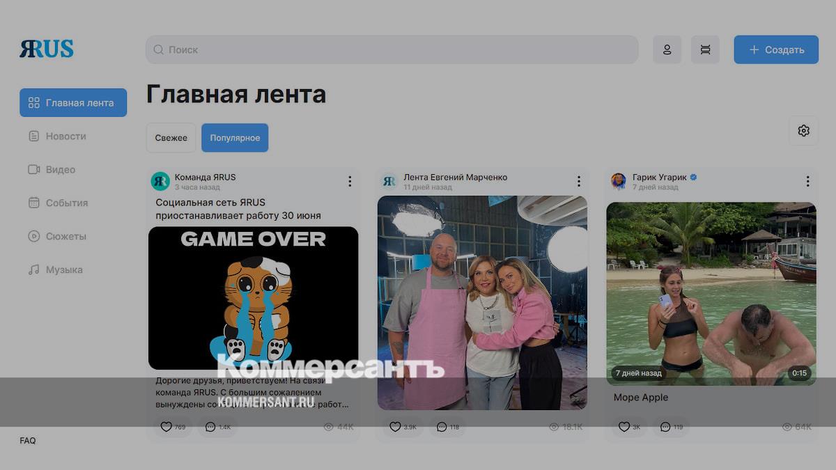 Российская социальная сеть ЯRus объявила, что приостанавливает работу, а с 30 июня ее серверы будут отключены. В Telegram-канале соцсети указано, что решение о «приостановке работы» сервиса было принято «после тщательного анализа текущей ситуации». Как ранее сообщал центр «Досье» Михаила Ходорковского (объявлен в РФ иностранным агентом) со ссылкой на утекшие документы, ЯRus создавалась на деньги основателя ЧВК «Вагнер» Евгения Пригожина. Источник «Ъ», знакомый с планами руководства соцсети, говорит, что компания—учредитель ЯRus (АО «Диалог», учредители в ЕГРЮЛ не заявлены) будет ликвидирована.
