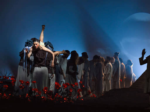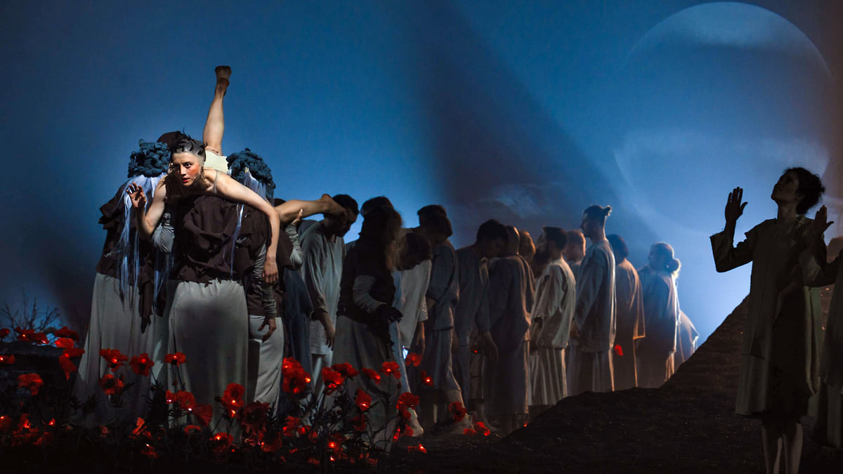 Маковую поросль в конце Пролога исступленно, торопясь, выпалывают голыми руками артисты миманса и танцовщики; они уносят с собой охапки цветов, и мир сразу же оказывается бескрасочен, бесцветен. И тогда вдруг вступает звонкий тенор Эвмолпа — рассказчика и жреца Деметры (Егор Семенков); начинается основная часть спектакля — «мелодрама» с музыкой Стравинского.