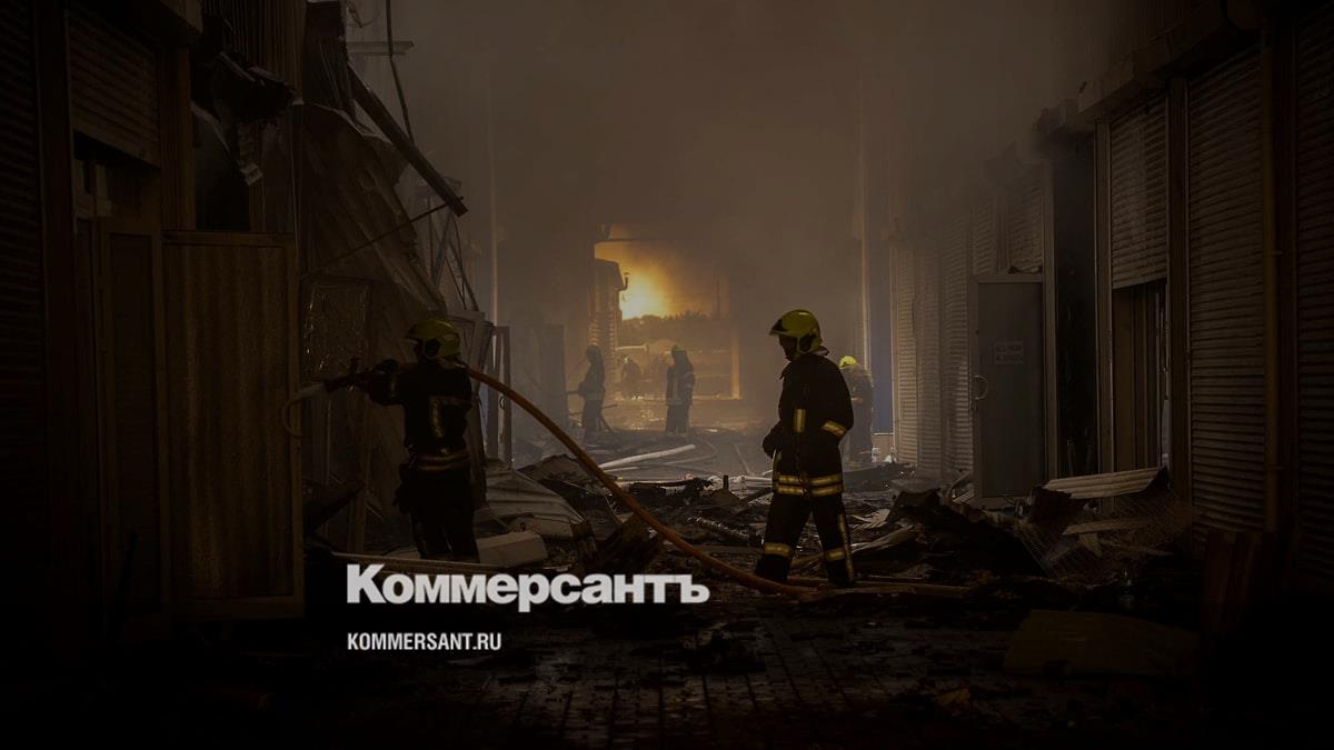 Пожарные пытаются погасить огонь на складе, разрушенном в результате российского ракетного удара по одесскому порту (19 июля 2023 года)