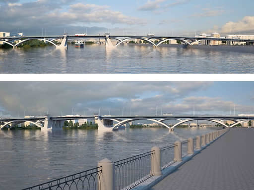 В настоящий момент проектная документация находится в стадии загрузки в ФАУ «Главгосэкспертиза России», сообщают в пресс-службе КРТИ. На переправе будет шесть полос движения автотранспорта, два полотна для трамваев, пешеходная и велосипедная дорожки. Общая длина нового моста составит 2,2 км, это будет самая широкая разводная переправа в городе.