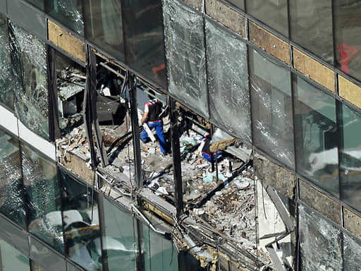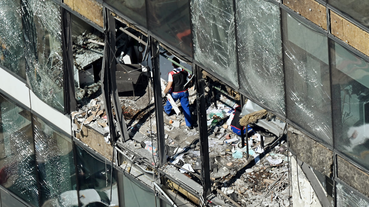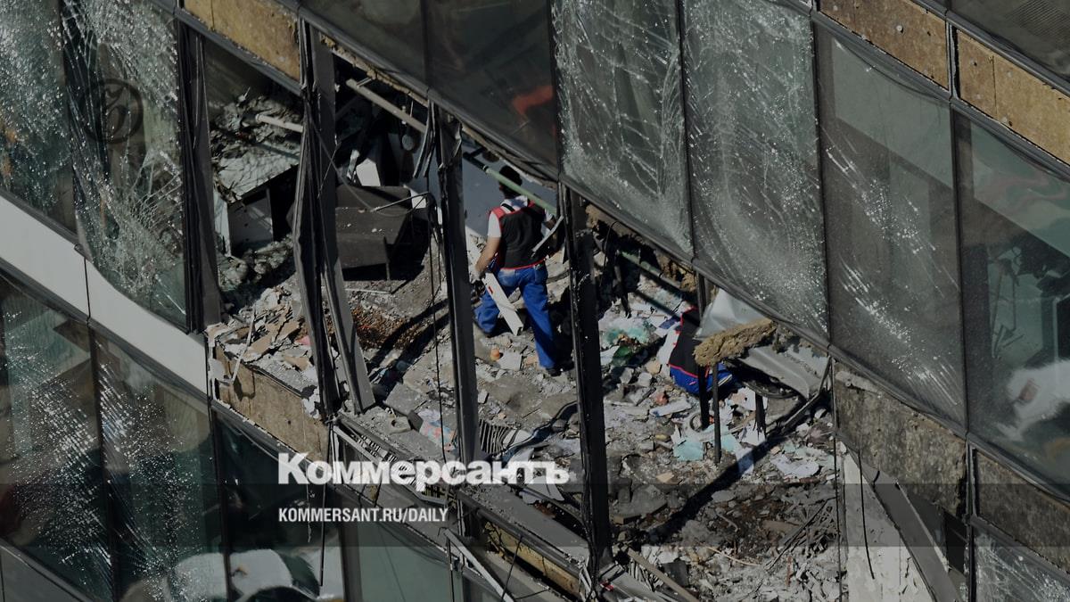 Взрывной волной выбило или повредило стекла общей площадью 500 кв. м на фасаде, буквально снесло офисные помещения, но к пожару и повреждениям несущих конструкций здания атака не привела.