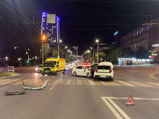 Водитель KIA Cerato при выполнении разворота не уступил дорогу автомобили скорой помощи, которая двигалась в прямом встречном направлении. После этого легковой автомобиль наехал на KIA Soul.