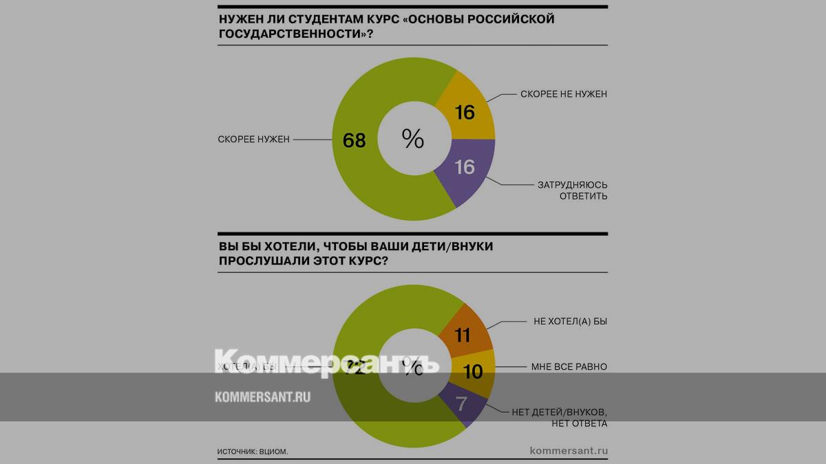 Как показал опрос ВЦИОМа, большинство россиян одобряют введение в вузах новой дисциплины, направленной на «формирование у обучающихся системы знаний, навыков, умений и ценностей, связанных с осознанием принадлежности к российскому обществу и развитием чувства гражданственности». Большинство сторонников видят пользу от «Основ российской государственности» в получении студентами дополнительных знаний о стране и ее истории (32% и 24% респондентов соответственно), а также патриотическом воспитании учащихся (17%). Против введения курса высказались 16% респондентов. В основном они считают его «бесполезным предметом» (28% из числа назвавших курс ненужным), пропагандой (17%) или дублированием других предметов (16%). В числе тем, которые должны обсуждаться на курсе, в ответах респондентов с большим отрывом лидирует история (25%). На втором месте — патриотическое воспитание (5%).