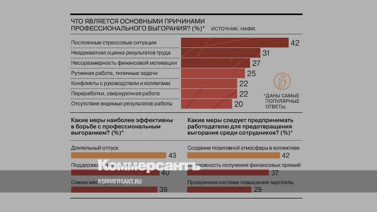 Большинство работающих россиян знакомо с термином «профессиональное выгорание». Практически каждый второй (45%) сталкивался с ним на практике, показало исследование НАФИ. 42% опрошенных называют основной причиной профессионального выгорания постоянные стрессы на работе. Отсутствие карьерного роста и профессионального развития упоминается гораздо реже (18%). Самой популярной мерой для борьбы с выгоранием россияне считают длительный отпуск. От работодателей преимущественно ожидается создание позитивной атмосферы в коллективе и финансовое стимулирование.