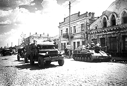 "Моя группа состояла из четырех машин,— вспоминал маршал Конев.— Впереди меня шел 'виллис' с адъютантом, далее моя машина. Я сидел на переднем сиденье, рядом с водителем. В кузове — постель и подушка. За мной шла машина 'додж' с охраной, а далее — бронетранспортер. Все машины, преодолевая грязь и глубокие колеи, проделанные танкистами, шли на первой скорости. Рев наших моторов заглушал все, и мы не слышали шума самолетов. Неожиданно вокруг наших машин на площади примерно 50 на 100 м все озарилось пламенем, раздались взрывы бомб и свист осколков. Я приказал шоферу выключить свет фар, но впереди идущий 'виллис' остановился и загородил дорогу. Моя машина наехала на него, от толчка опять включился свет, и шофер не мог его погасить. Проходит минута, две. Мы слышим второй заход самолета, и новая серия бомб рассыпалась возле наших машин. Наконец свет фар погас. Все четыре машины остановились. Самолетов в ночном небе уже не было слышно. Осмотрев машины, мы увидели, что у моей 'эмки' пробиты мелкими осколками оба ветровых стекла".