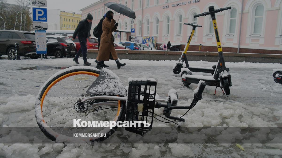 Упавший в сугроб после снегопада прокатный велосипед