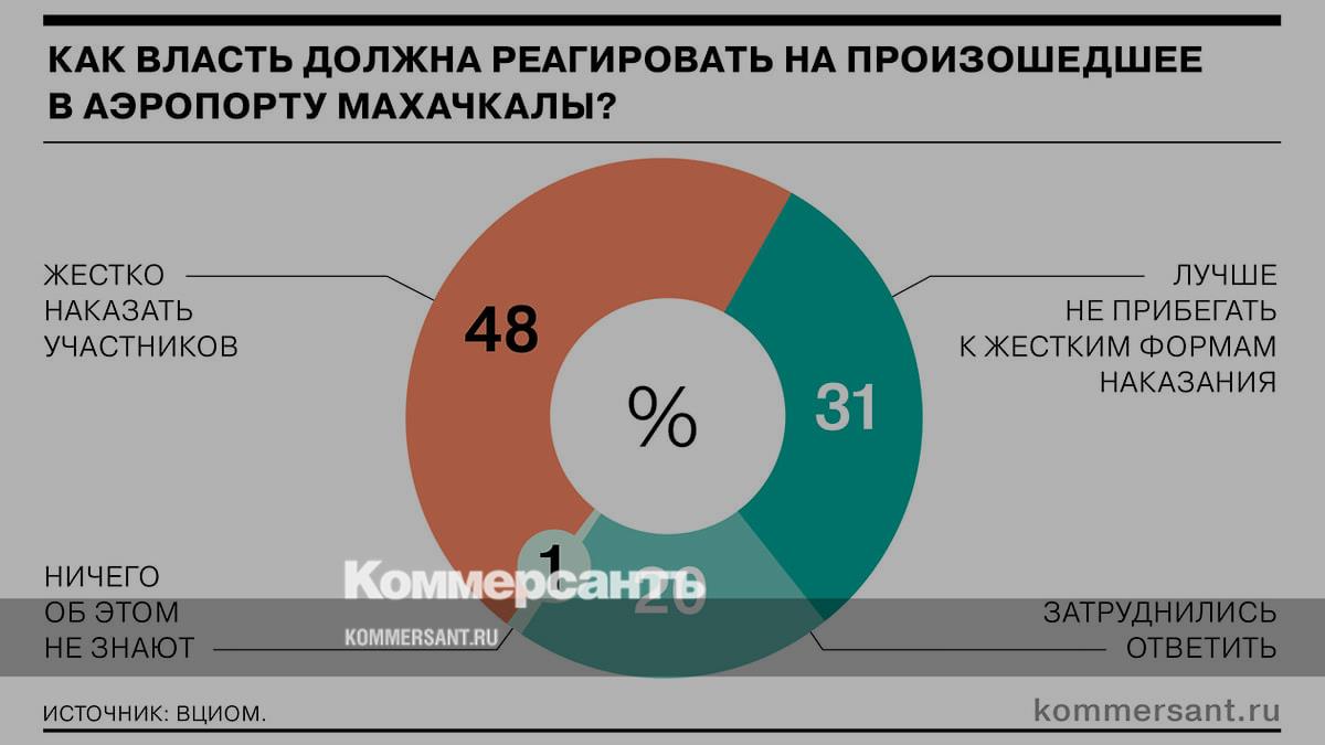 Почти каждый второй опрошенный выступает за жесткое наказание участников беспорядков в аэропорту, каждый третий высказался против, каждый пятый не определился. Добавим, что президент Путин, комментируя события в Махачкале на встрече с новым составом Общественной палаты 3 ноября, отметил, что на них следует отреагировать «в соответствии с законом».