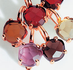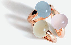 В кольцах коллекции Sassi огранки нет и в помине: полудрагоценные камни обточены, "обмыты", как морская галька, до состояния кабошона. Кстати, ювелиры Pomellato были одними из первых, кто обратил внимание на мягкие формы кабошона, своеобразной огранки, которая сегодня является одной из самых модных. Более того, для изготовления колец с кабошоном мастера разработали специальную хитроумную технику. Камень не вставляют в оправу, а как бы "доливают" золотом по форме.