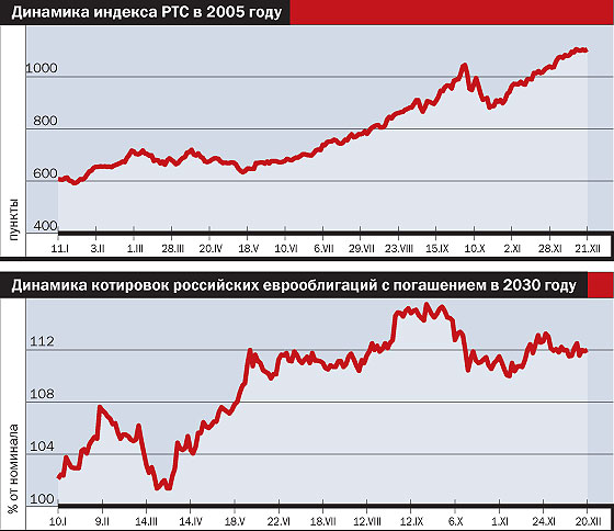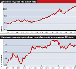 Другого сценария придерживаются аналитики Объединенной финансовой группы (ОФГ). По их оценке, начало 2006 года может ознаменоваться стремительным ростом котировок и достижением индекса РТС отметки 1500 пунктов. Этому будет способствовать рост ликвидности на российском рынке, вызванный укреплением курса евро на мировом рынке. Кроме того, ожидается пересмотр в большую сторону прогноза цен на нефть. Это, безусловно, ведет и к пересмотру стоимости российских активов. Вместе с тем в середине года возможна чувствительная коррекция. В первую очередь риск будет определяться ожиданием замедления экономики США, что негативно отразится на конъюнктуре мировых рынков. Но даже в отсутствие внешних потрясений некоторое охлаждение российского рынка может быть связано и с внутренними факторами. В частности, большим числом размещений российских эмитентов. По оценке аналитиков ОФГ, этот объем может составить около 16% текущей рыночной капитализации акций в свободном обращении, включенных в индекс MSCI Russia. В результате по итогам года можно ожидать роста индекса до уровня 1350 пунктов.