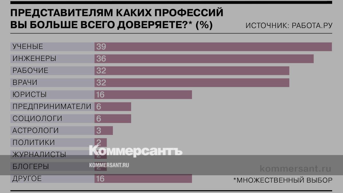 Список профессий, представителям которых россияне доверяют больше всего, возглавляют ученые, показал опрос сервиса «Работа.ру». Их выбрали более трети респондентов (39%). Среди других профессий, получивших наибольшее количество упоминаний,— инженеры, рабочие и врачи. Астрологам доверяют лишь 3% респондентов. Тем не менее по уровню доверия они обходят политиков и журналистов.