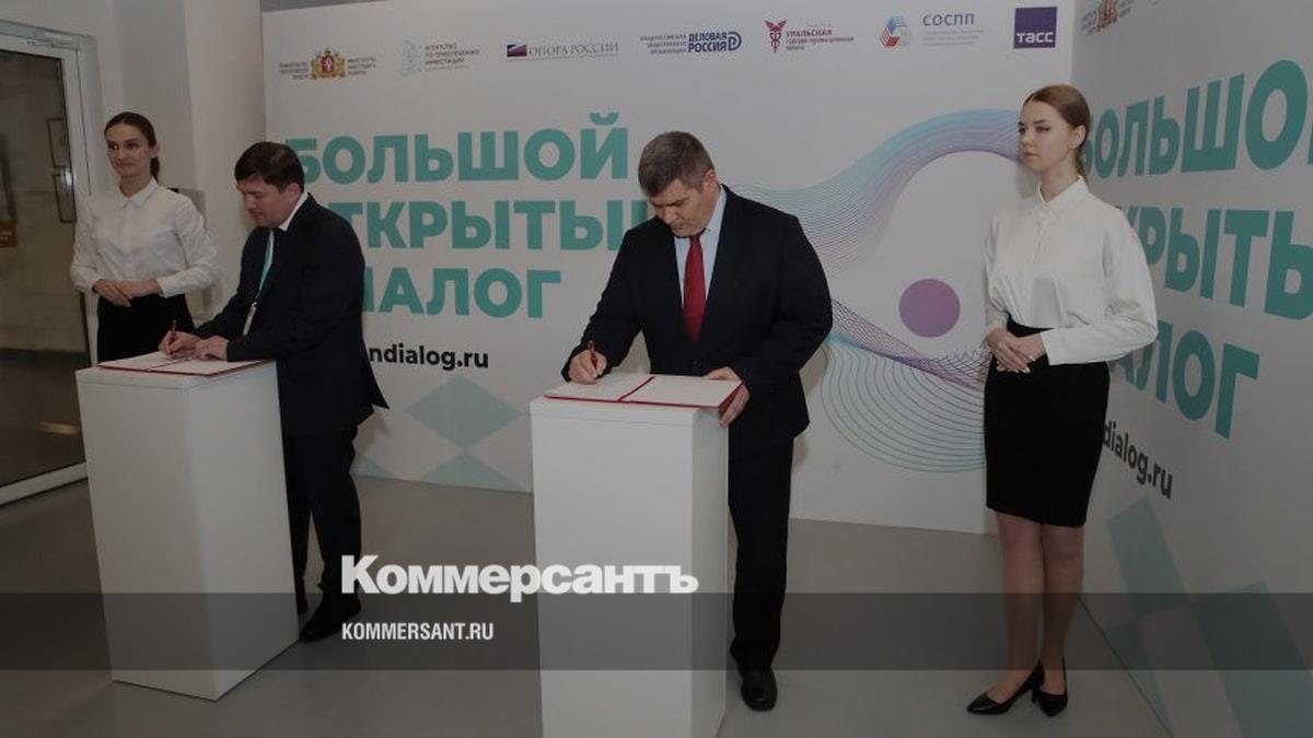 Первый замгубернатора Свердловской области Алексей Шмыков (слева) и первый замначальника Свердловской железной дороги (СвЖД) Артем Панов (справа) во время подписания соглашения