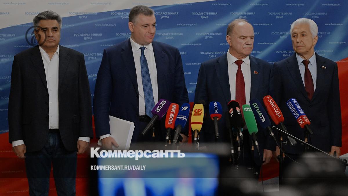 Глава фракции партии «Новые люди» в Госдуме Алексей Нечаев, лидер ЛДПР Леонид Слуцкий, лидер КПРФ Геннадий Зюганов и глава фракции «Единая Россия» в Госдуме Владимир Васильев