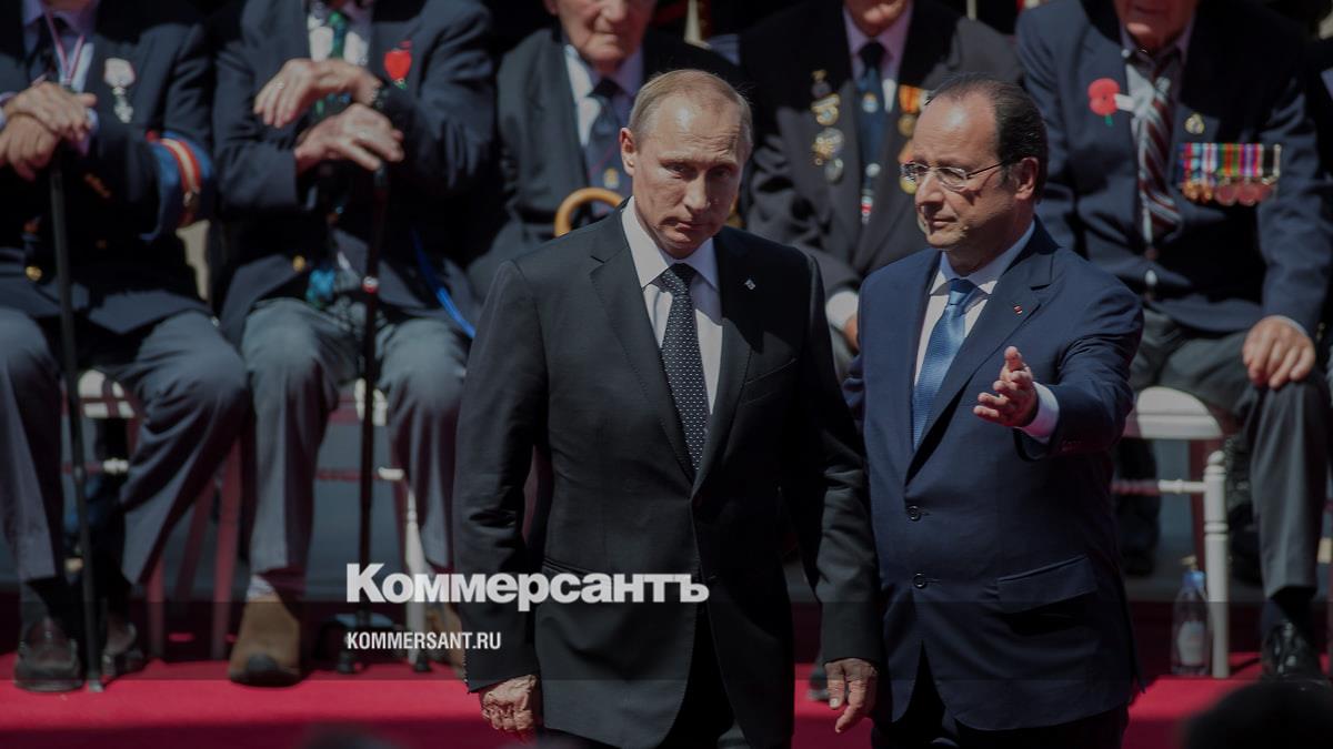 Президент России Владимир Путин и президент Франции Франсуа Олланд на праздновании 70-й годовщины высадки союзников в Нормандии в 2014 году