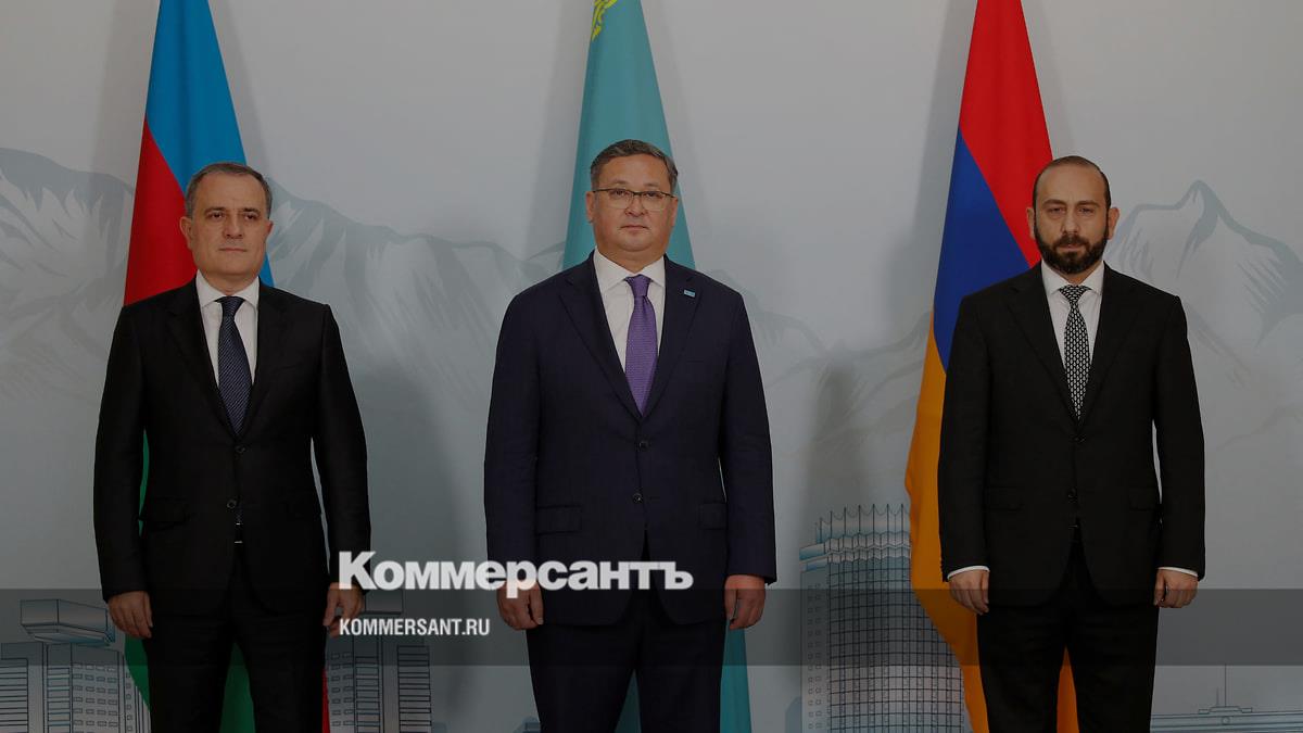 Слева направо: глава МИД Азербайджана Джейхун Байрамов, глава МИД Казахстана Мурат Нуртлеу и глава МИД Армении Арарат Мирзоян