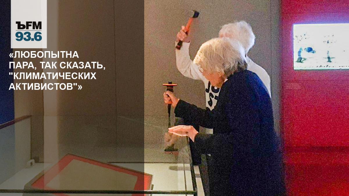 Любопытна пара, так сказать, «безобразников» или «климатических активистов», если угодно. Это некие преподобная доктор Сью Парфитт, 82 лет от роду, и Джуди Брюс, 85 годов. Обе являются сторонниками радикальной группы Just Stop Oil. На видео, опубликованном в социальных сетях этого движения, Парфитт достает зубило и приставляет его к стеклу, в то время как ее соратница несколько раз ударяет по инструменту отбойным молотком. Затем Парфитт размахивает транспарантом с надписью The government is breaking the law.