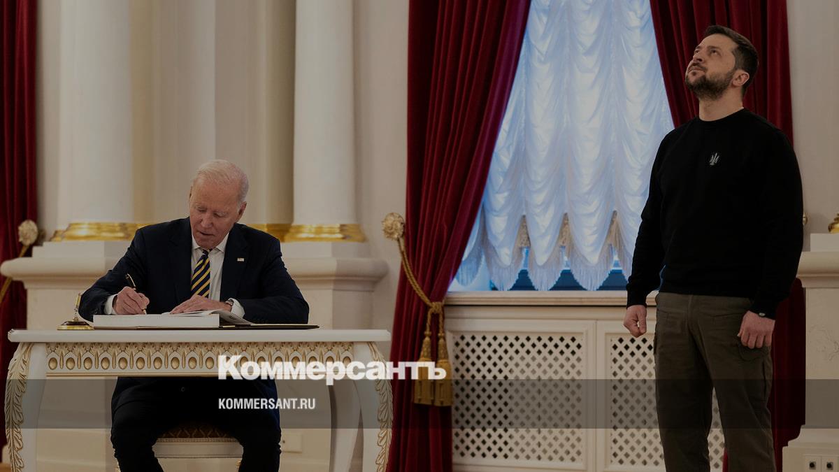 Джо Байден (слева) и Владимир Зеленский во время встречи в Киеве в феврале 2023 года
