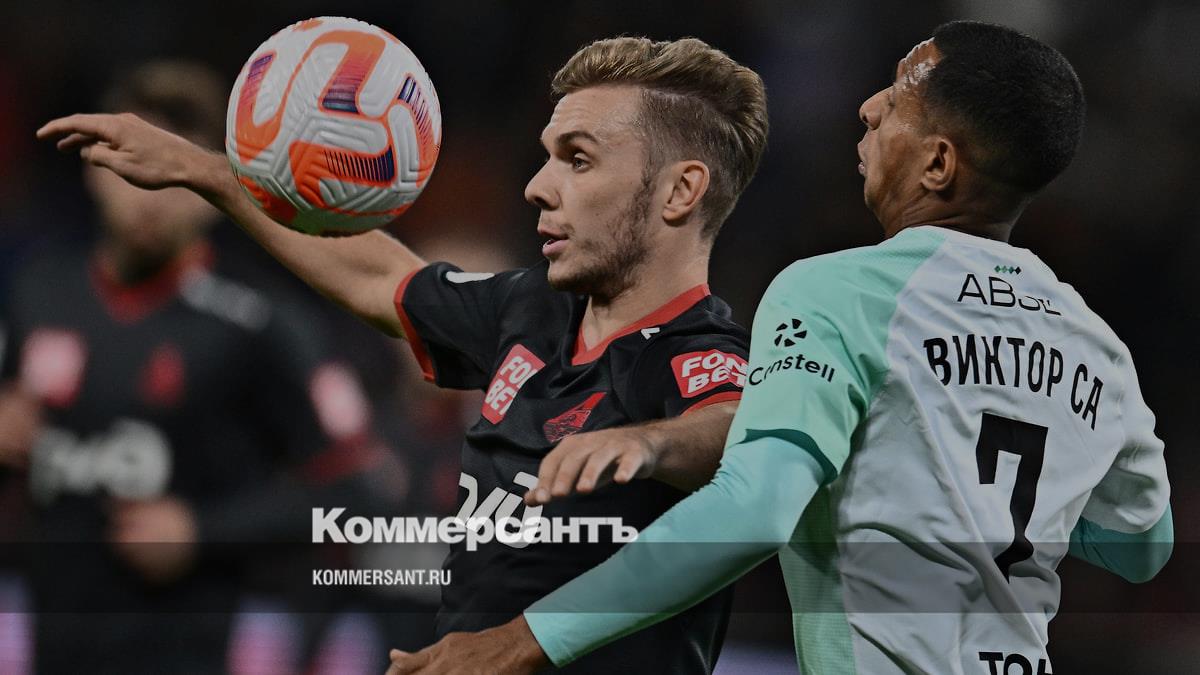 Игрок команды «Локомотив» Максим Глушенков (слева) во время матча против ФК «Краснодар».