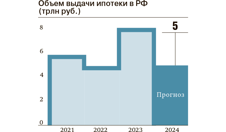 5 триллионов рублей может составить объем выдачи ипотеки по итогам 2024 года, следует из прогноза «Дом.РФ». Таким образом, показатель снизится на 35% по сравнению с результатом 2023 года, когда банки выдали 7,8 трлн руб. ипотечных кредитов. Основное сокращение объемов в годовом выражении ожидается во второй половине года: если в январе—июне, по оценкам «Дом.РФ», будет выдано 2,7 трлн руб. жилищных кредитов (минус 12% год к году), то в июле—декабре — уже 2 трлн руб. (минус 58%). Связаны такие ожидания со сворачиванием с 1 июля массовой льготной ипотеки, в частности на новостройки под 8%, и переходом к более адресной поддержке спроса при высоких рыночных ставках.