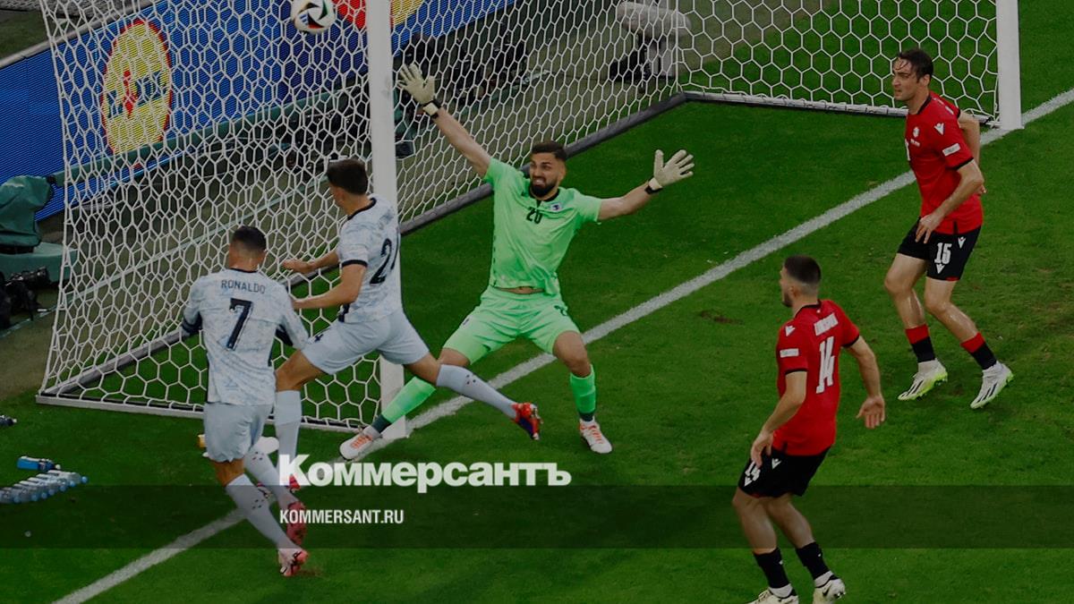 Португальские игроки Криштиану Роналду (слева) и Антониу Силва пытаются пробить ворота вратаря сборной Грузии Георгия Мамардашвили