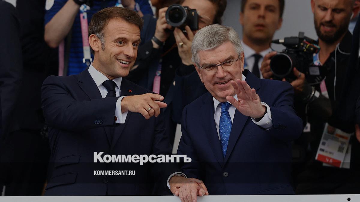 Президент Франции Эмманюэль Макрон (слева) и глава Международного олимпийского комитета Томас Бах приветствуют спортсменов и гостей Олимпиады