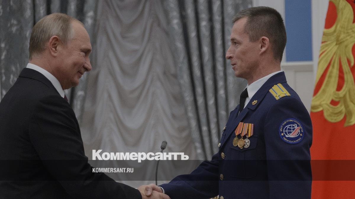 Президент России Владимир Путин (слева) и космонавт-испытатель Сергей Рыжиков (справа) на церемонии вручения государственных наград
