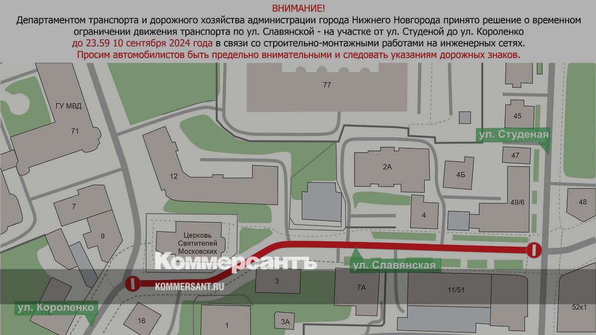 В Нижнем Новгороде часть Славянской улицы от улицы Студеной до улицы Короленко будет закрыт для транспорта до 10 сентября, сообщили в мэрии. С 1 марта на участке ремонтируют инженерные сети и меняют магистральный теплопровод.