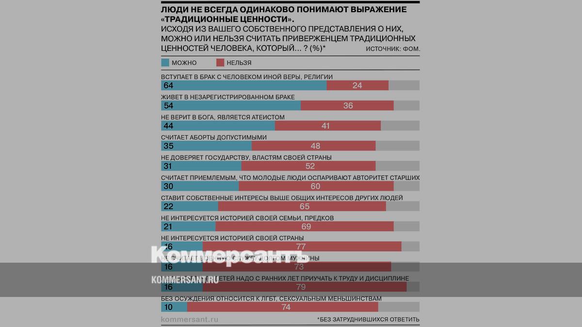 Большинство респондентов (85%), принявших участие в исследовании фонда «Общественное мнение» (ФОМ), считают себя приверженцами традиционных ценностей. Услышав это словосочетание, они чаще всего думают о семье и детях, культурном наследии и традициях, патриотизме, вере в Бога. Ответы на уточняющие вопросы показали, что для большинства опрошенных традиционные ценности совместимы с такими явлениями, как брак с человеком иной веры (64%) или незарегистрированный брак (54%). Чаще всего не считают приверженцами традиционных ценностей людей, которые не склонны с ранних лет приучать детей к труду и дисциплине (79%) и не интересуются историей своей страны (77%).