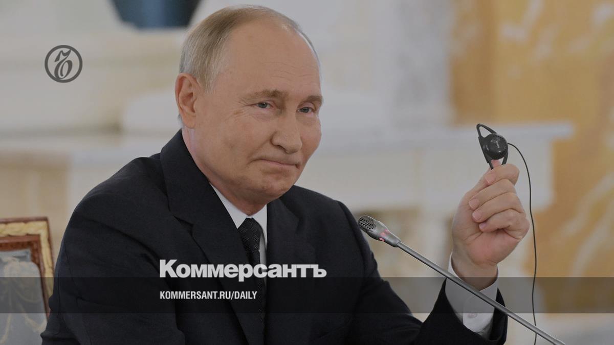 Президент России Владимир Путин объясняет участникам встречи, как они его услышат