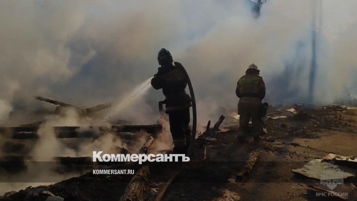 Кровля складского помещения обрушилась по всей площади. Здание целиком построено из дерева, была опасность распространения на соседние постройки. Сейчас происходит проливка и разборка сгоревших конструкций.