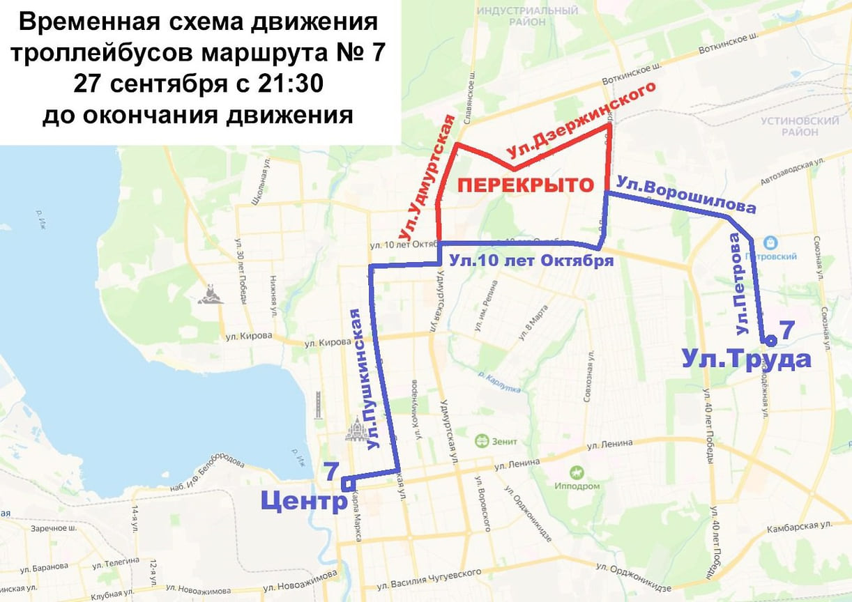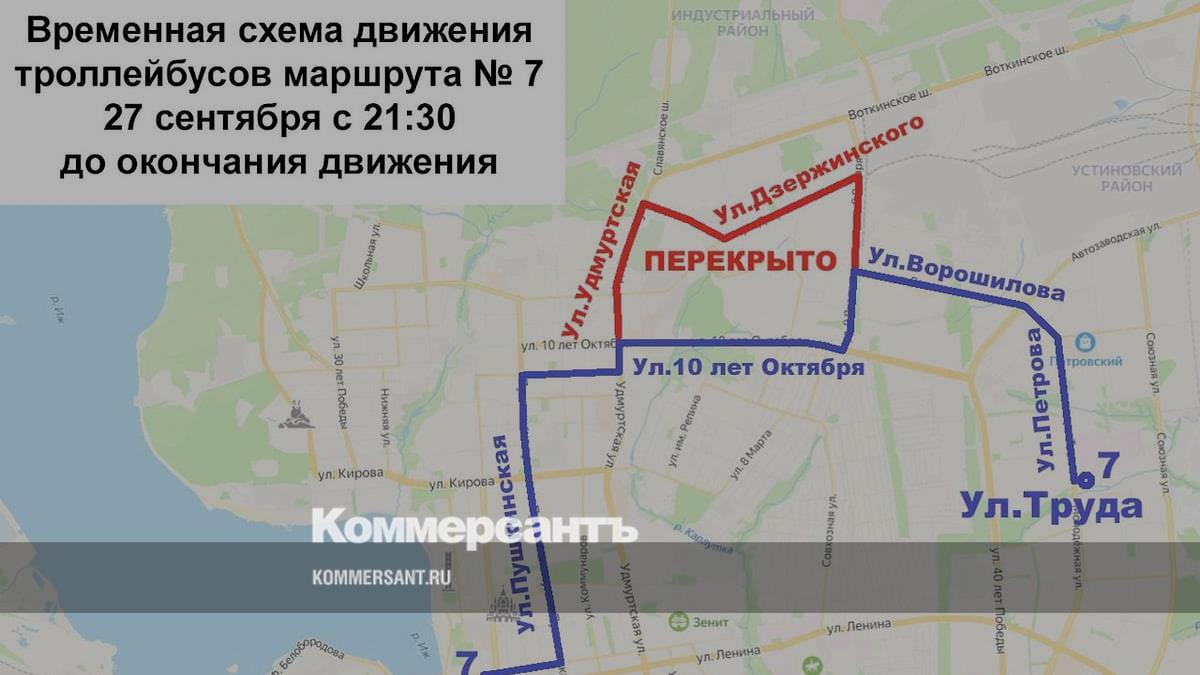Последний рейс троллейбуса №7 от Центра запланирован на 21:22, от ул. Труда — на 21:16. После 21:22 движение организуют через Центр, улицы Пушкинская, 10 лет Октября, Ворошилова, Труда и обратно.