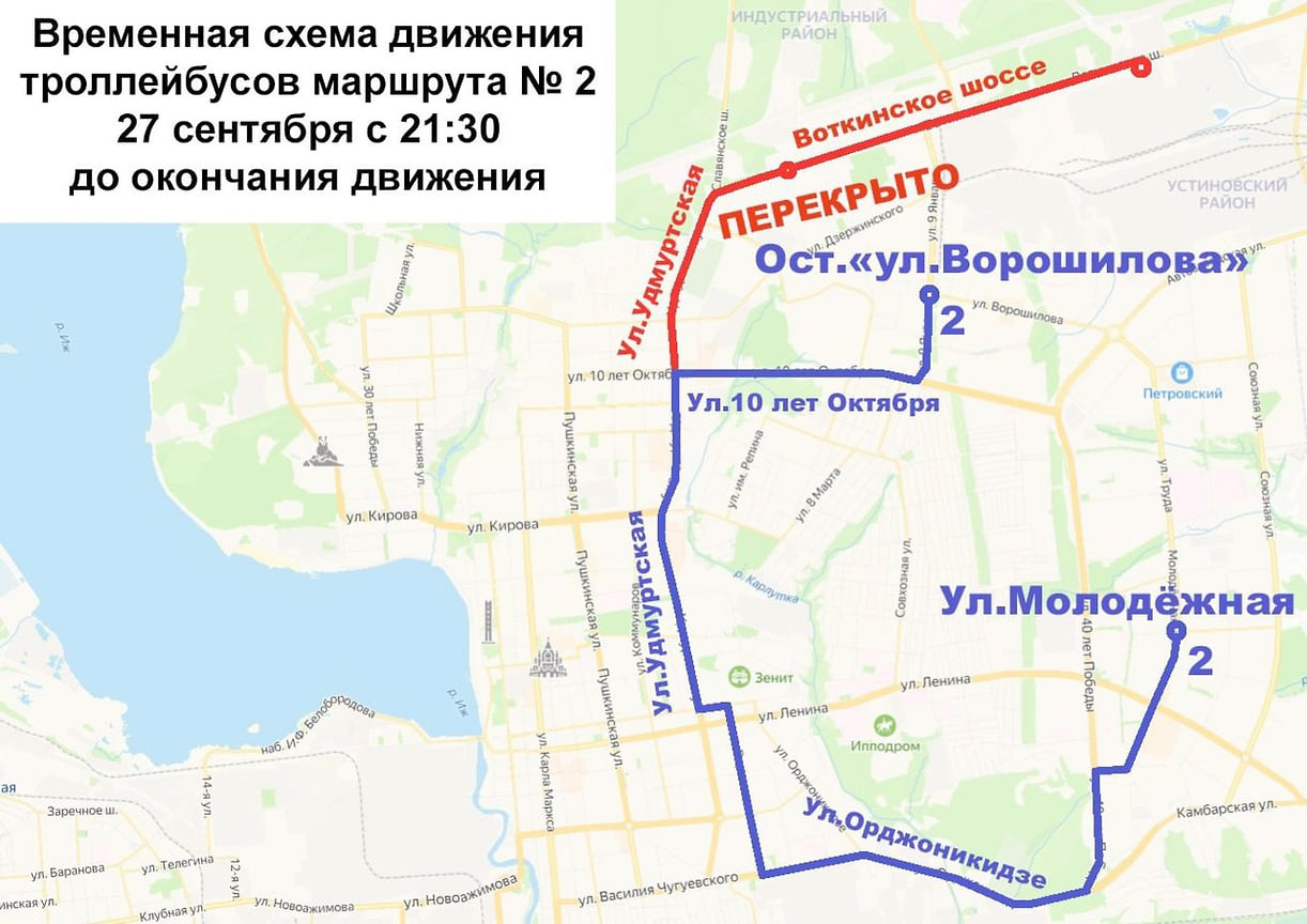 Троллейбус №2 в этот день будут ходить от ул. Молодежная до 20:55, от администрации Индустриального района — до 21:43. После 21:43 движение по маршруту №2 организуют через улицы Молодежная, Орджоникидзе, Удмуртская, 10 лет Октября, 9-е Января, Ворошилова и в обратном направлении.