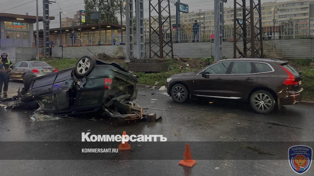 Иномарка опрокинулась на крышу после удара об опору ЛЭП на Витебском проспекте