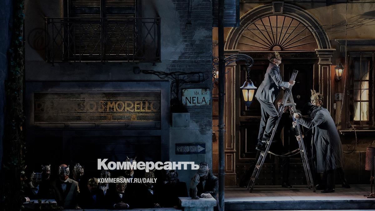 В его свеженьком «Риголетто» царствует безопасная оперная традиционность. Главные арии солисты поют, располагаясь, как правило, строго посреди сцены перед дирижером. Остальные артисты тоже особо не суетятся, даже когда в первых сценах изображают старый добрый «оперный» разврат, на который всегда немножко неловко смотреть. Эта часть спектакля, разыгрывающаяся в бордельно-красном герцогском дворце с огромной хрустальной люстрой (довольно обидный привет зрительному залу напротив), самая скучная. Еще две локации спектакля — неореалистическая итальянская улочка с широкой каменной лестницей, ведущей с верхнего социального этажа к бедному жилищу Джильды, и затейливая хибара ее будущих убийц со стоящим рядом огромным деревом, которое аккуратно рухнет от удара грозы в момент злодеяния. Монументальные и доходчивые декорации каталонца Антонио Ромеро всякий раз после открытия занавеса вызывают вздох восхищения в зале.