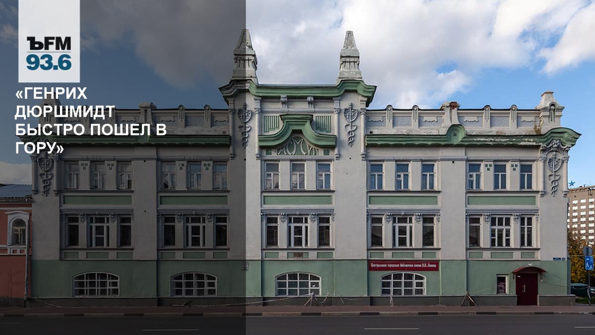 В общем, он быстро пошел в гору, завел собственное производство, стал купцом первой гильдии, коммерции советником и поселился в Нижнем неподалеку от знаменитой ярмарки. Вот тогда он и скупил несколько домов по улице Большой Московской и реконструировал их. Таким образом появился «Дом со змеями», ставший доходным. Во времена Первой мировой войны дом у немца Дюршмидта пришли отбирать. Но оказалось, что и он, и вся его семья давно уже российские подданные. Однако с домом через несколько лет все равно пришлось расстаться — его экспроприировали большевики, разместили в здании жилые квартиры. Позже, в 1972 году, дом полностью отдали местной библиотеке имени Ленина. Находится она здесь и по сей день.