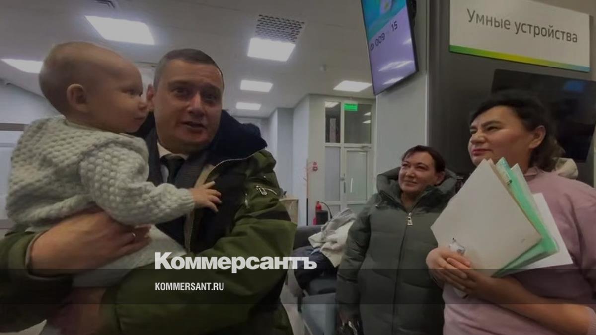 Врио губернатора Курской области Александр Хинштейн (держит ребенка на руках) и полномочный представитель президента РФ в ЦФО Игорь Щеголев провели встречу с переселенцами из приграничных районов