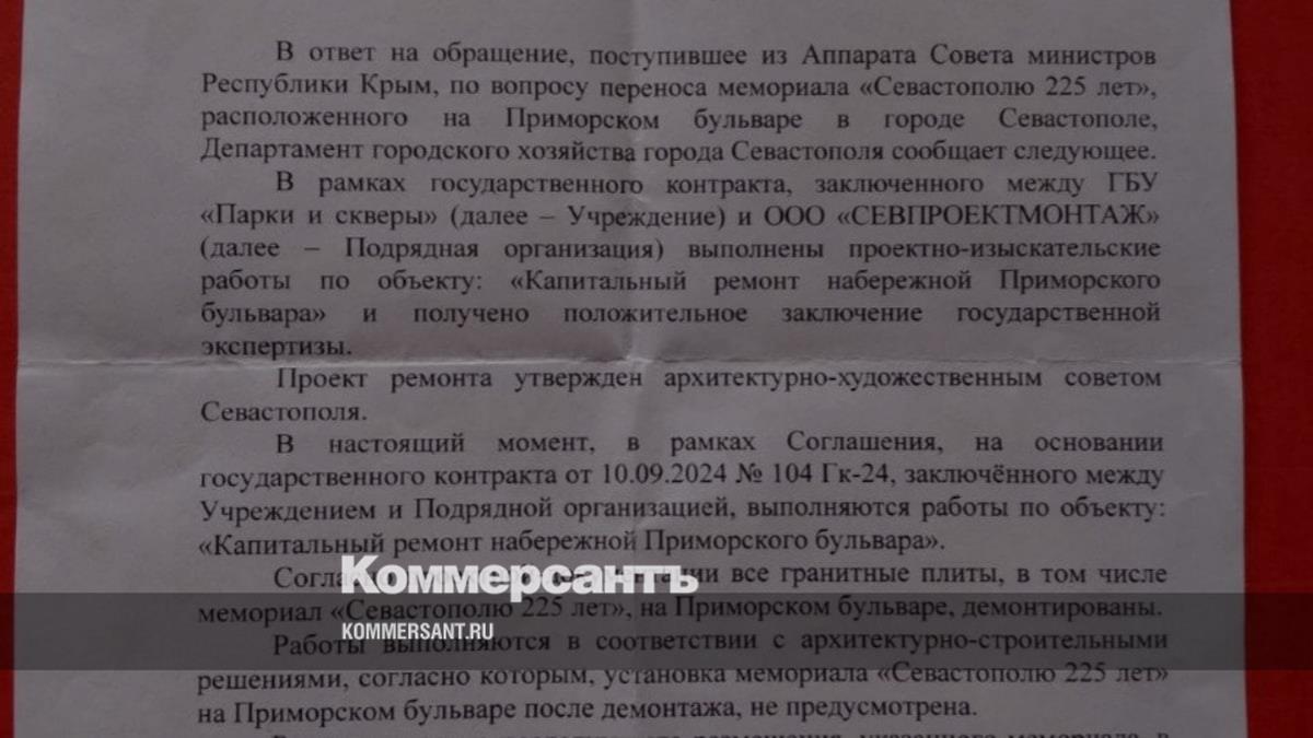 Департамент городского хозяйства Севастополя принял решение о демонтаже мемориала «Севастополю 225 лет» на Приморском бульваре. Памятный знак, установленный в 2008 году, убрали после неоднократных обращений активиста из Ярославля Сергея Казанского, пишет «Ъ-Ярославль».