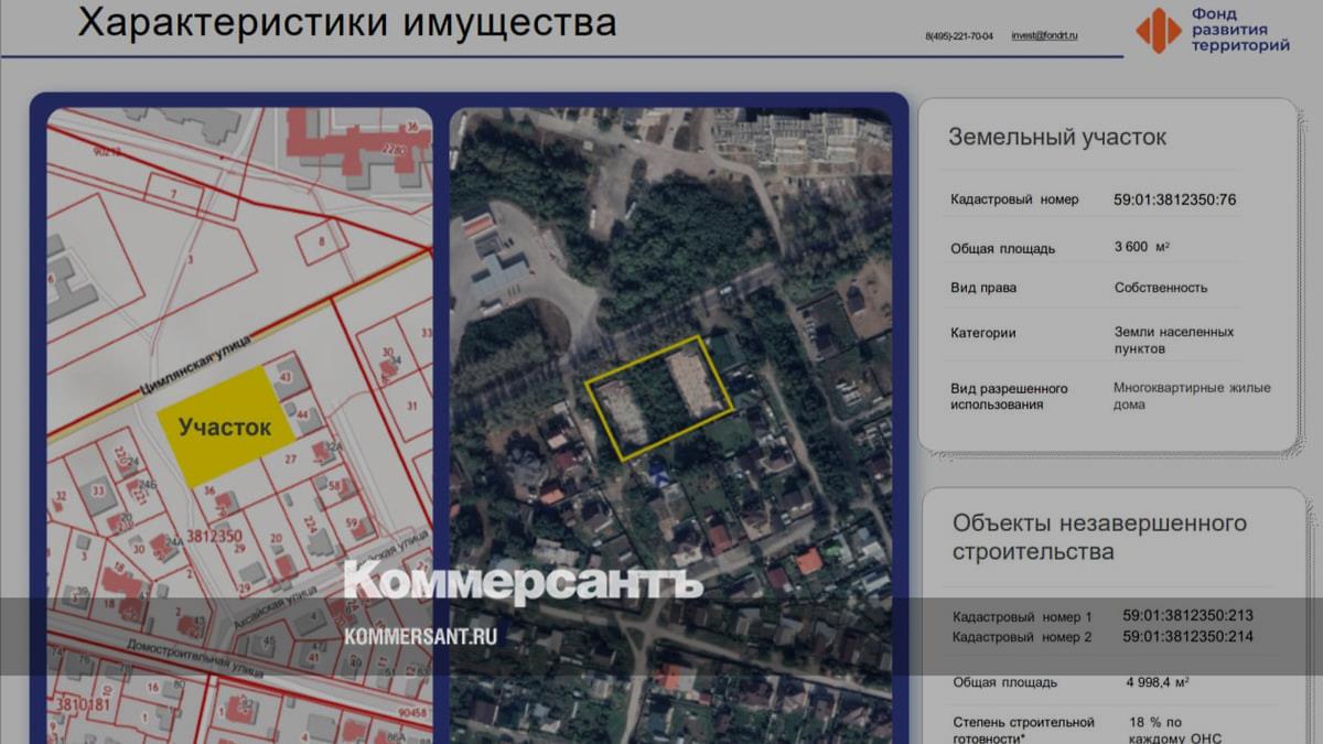 Фонд развития территорий вновь объявил торги по продаже земельного участка с объектами незавершенного строительства по ул. Цимлянской, 28 и 30, в Орджоникидзевском районе Перми. По сравнению с прошлыми торгами, начальная цена снижена и составляет 66,7 млн руб., также предусмотрена возможность оплаты в рассрочку равными ежемесячными платежами в течение года с первоначальным платежом 30%. Торги пройдут на площадке «Росэлторг», заявки на участие принимаются до 7 марта.