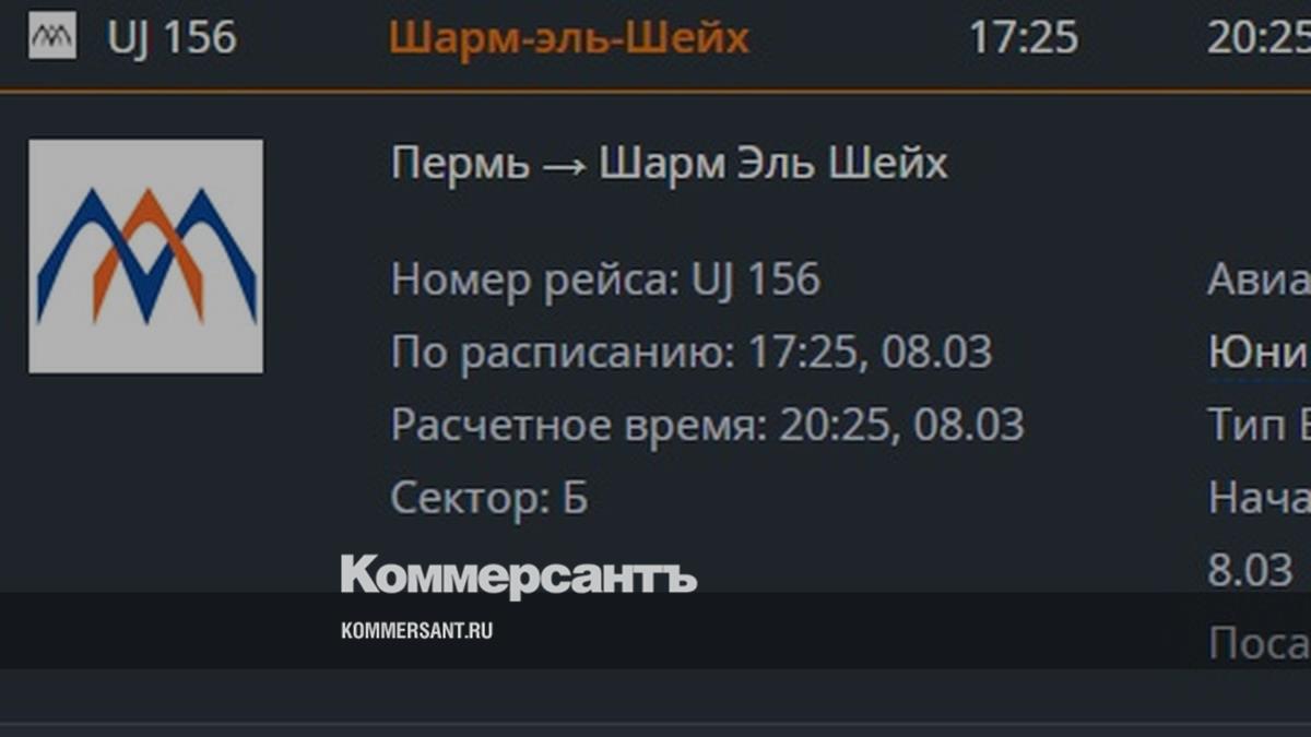 Задержанный изначально на 16 часов рейс UJ 156 «Пермь-Шарм-эш-Шейх» вчера не вылетел, свидетельствуют данные расписания аэропорта Большое Савино. По расписанию он должен был вылететь из Перми 7 марта в 04:15, затем его вылет перенесли на 20 часов вечера 7 марта. Сейчас, согласно данным онлайн-табло аэропорта, расчетное время вылета – 20 часов 25 минут 8 марта. Судно в Пермь должно прибыть в 19 часов 15 минут.