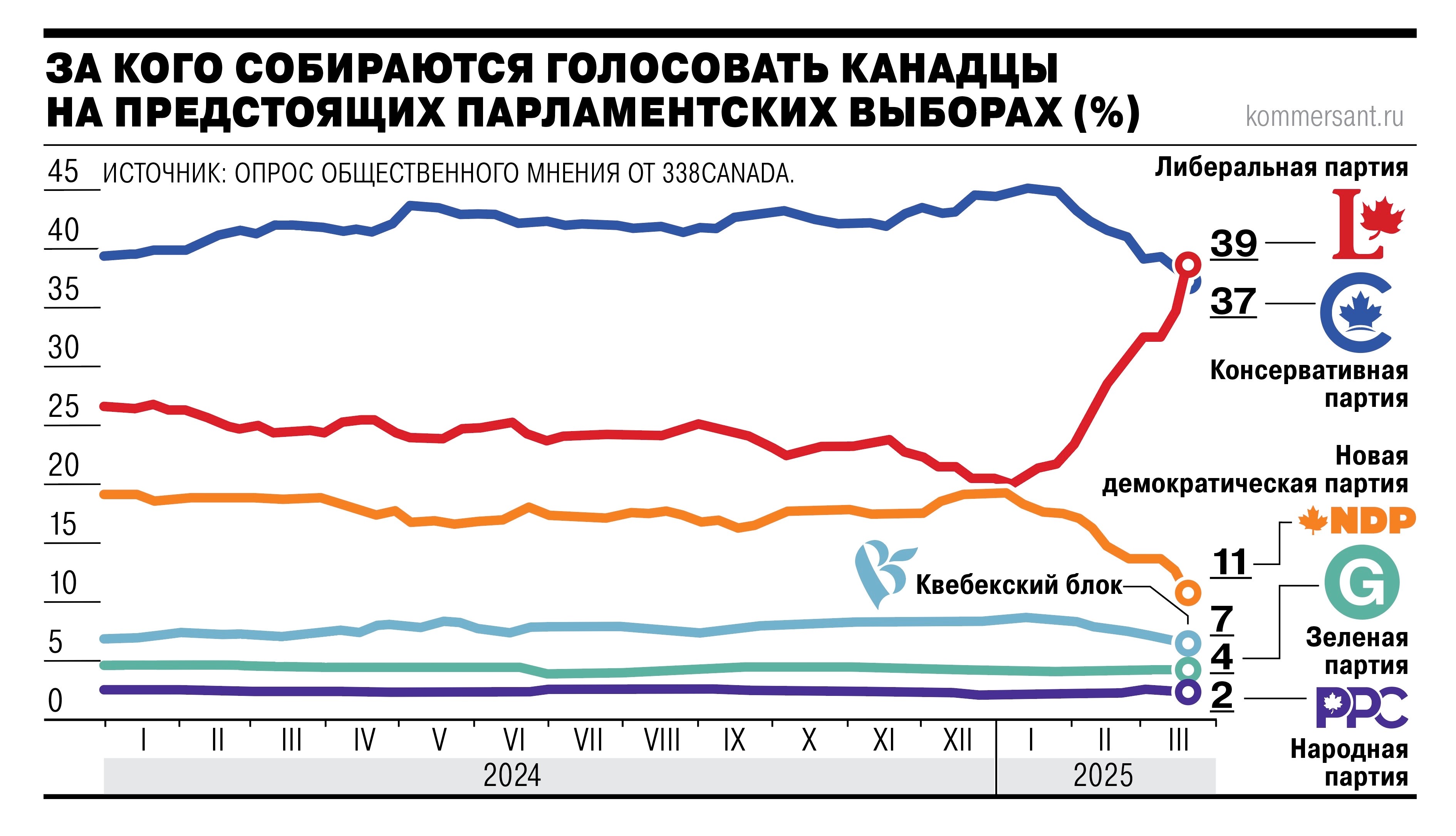 На фоне такого беспрецедентного скачка поддержки либералов Марк Карни, которому изначально выпала задача «досидеть» в премьерском кресле несколько месяцев вместо подавшего в отставку Джастина Трюдо, и решил поскорее объявить выборы, чтобы закрепить власть либералов еще на один срок, а заодно самому утвердиться в качестве полноправного и всенародно избранного главы правительства.