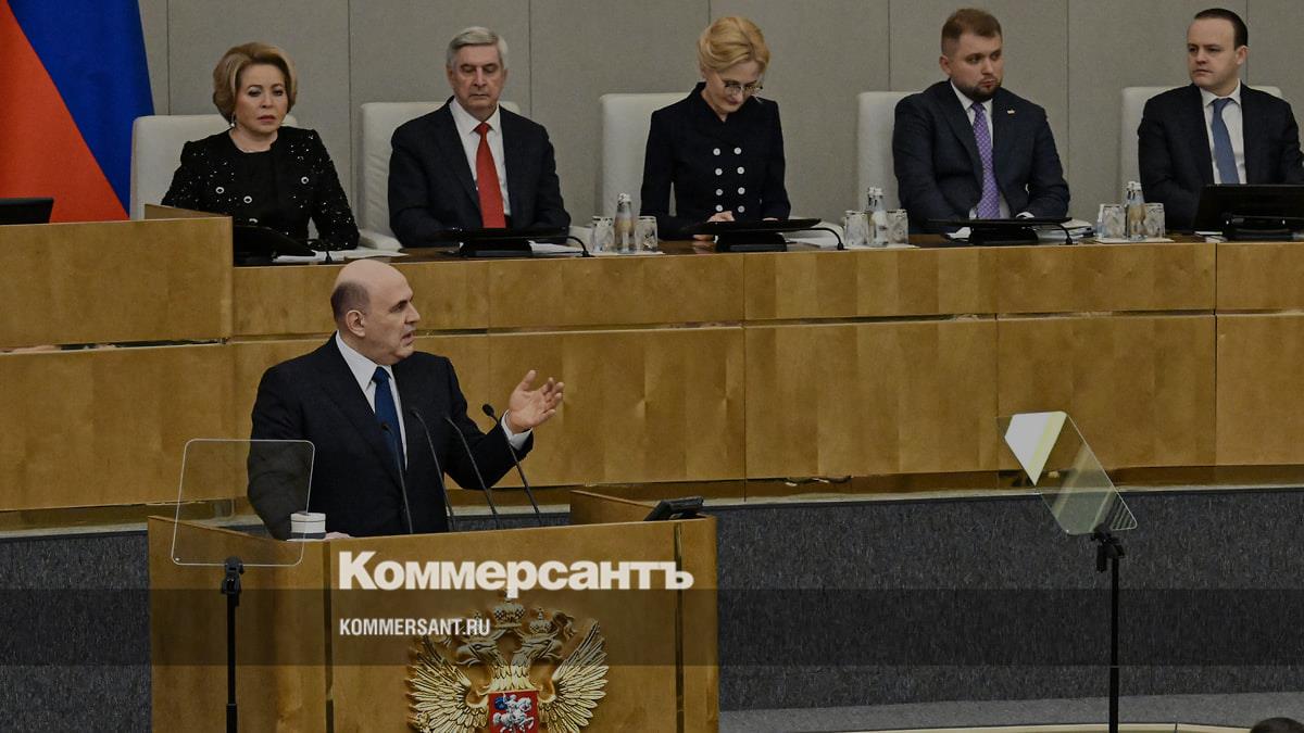 Михаил Мишустин (в центре) во время выступления на заседании в Госдуме